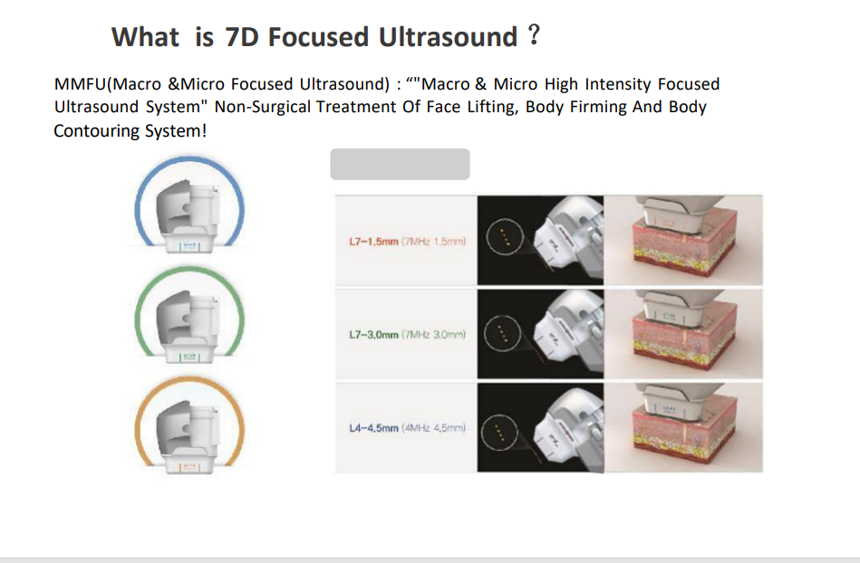El HIFU puede tratar afecciones cutáneas más profundas en comparación con otros dispositivos de radiofrecuencia o láser. Suministra energía ultrasónica focalizada de alta intensidad a capas mucho más profundas de la piel (incluyendo la epidermis, la dermis, el tejido subcutáneo y los músculos faciales).