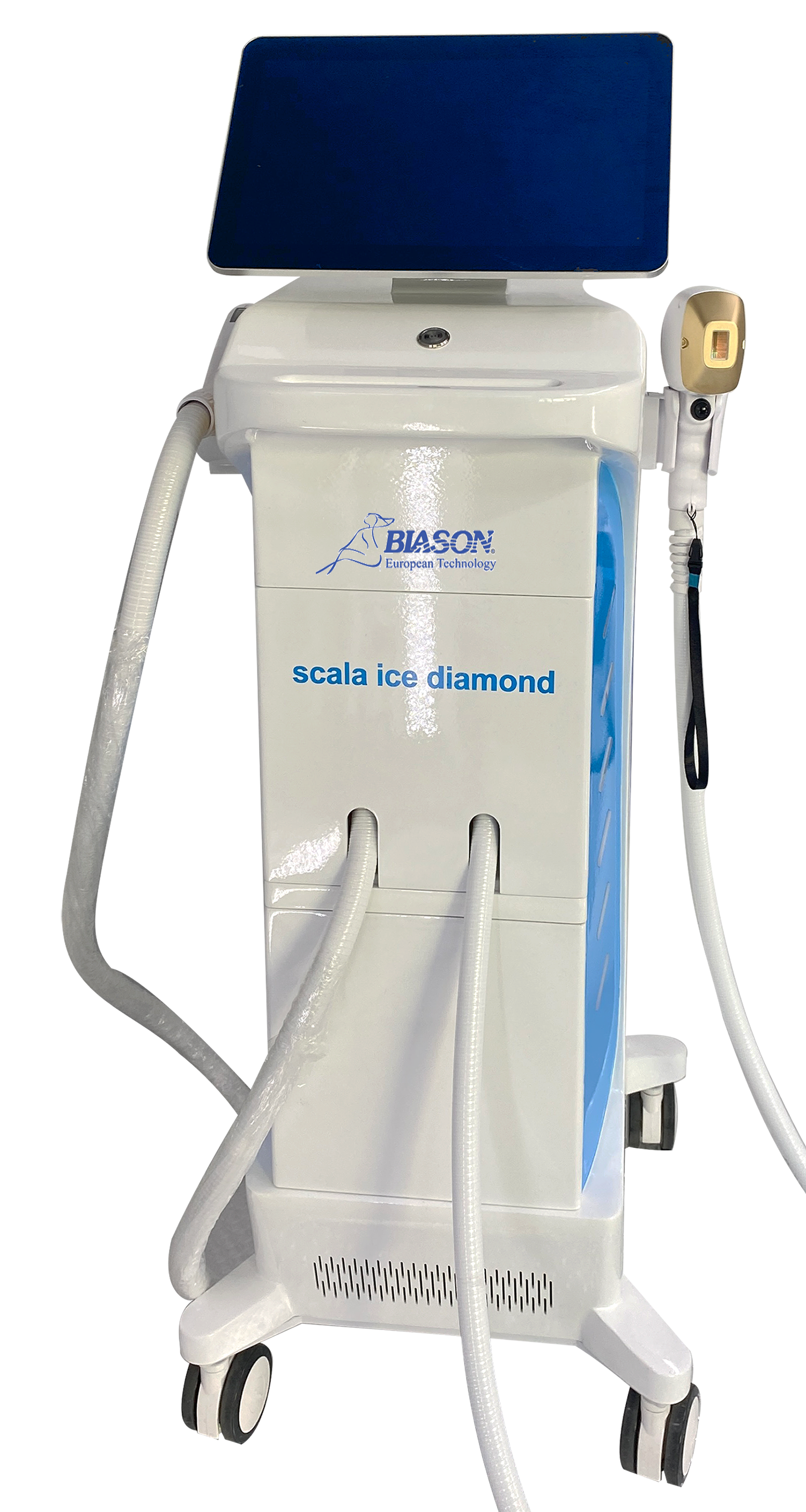 1- Scala Ice Diamond laser hair removal is based on the principle of photo thermodynamics, human skin is a relatively light-transmitting structure, using the power of the skin to transmit the light this powerful laser can get gently deep into the skin and reach the follicle where the hair grows targeting directly to the melanin which is a natural pigment that determines the color of the hair which absorbs a large amount of laser energy and converts it into thermal energy, triggering an increase in temperature in the hair follicle, destroying it and eliminating its ability to regenerate, thus achieving definitive hair removal.
