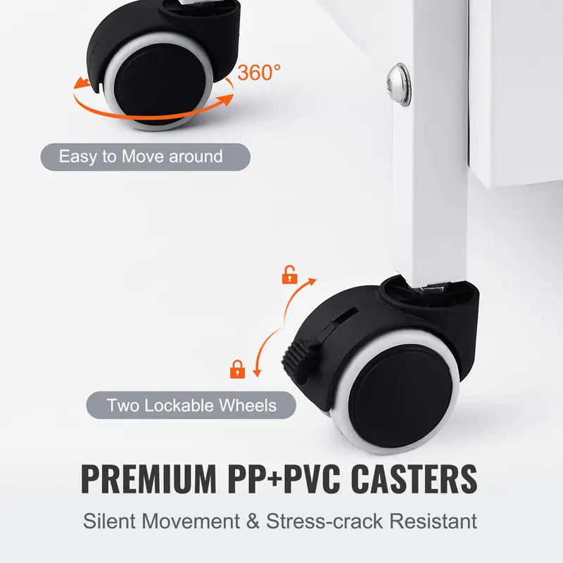 3 solid wooden shelves, 1 locking drawer, casters for easy mobility